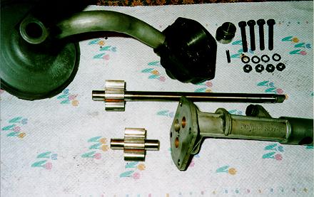 | Oil pump disassembled. Surface on alloy part was resurfaced to remove scoring. |