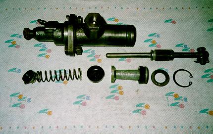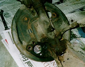 | Brake master cylinder, disassembled. Cylinder was in amazingly good condition and did not require honing | Front suspension spindle and brake backing plate in dirty, as-disassembled, condition. |