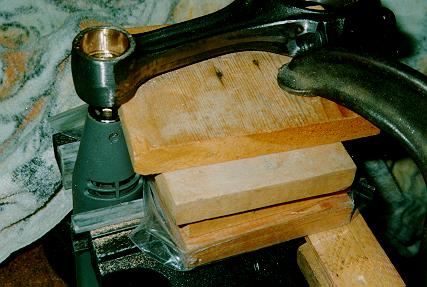 |  | Recutting oil groove in rod bushing. Dremel tool was gently held in vise and wood blocks were clamped down to vise. Rod end was moved, with careful pressure, in a circle around spinning tool. Then Dremel tool was raised a little and cut made at a different level. Three cuts were made. |