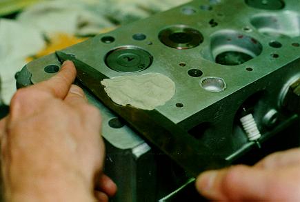 | Lapping valve seats. Lapping compound is in green can, stick with suction cup is used to spin valve. Grey areas where red dye is gone, on both valve and seat, show valve seat contact area. |