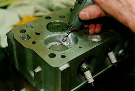 clay into chamber. Upper--After pressing clay into combustion chamber, it was cut off level with cylinder surface and then weighed. Left--Using dremel tool to remove metal to increase combustion cylinder volume. |