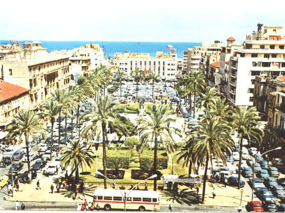 This place is called al Bourj Square (the square of the tower) or the Martyr's Square. It is exactly in the center of Beirut and divides the city into Moslem and Christian sections. That is why it became a "no man's land" and was completely destroyed during the (1975-1990) civil war. Before the war, the Martyr's Square was the most crowded area in Beirut. All of the offices, restaurants and movie theaters were there. Also, there was the central parking where all taxis (Pontons) used to gather and go to all the regions of Lebanon. Now, the Martyr's Square is a huge empty piece of land. Only one building remains and it became the Virgin Megastore. The white and red bus in this photograph is presumed to be a Mercedes-Benz since it is known that the government used to buy Mercedes-Benz and Renault vehicles. The bus system only lasted from 1970 until 1975.1 There are many Pontons in this photo.