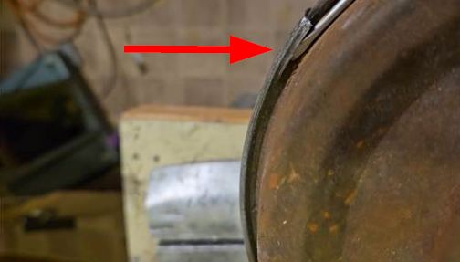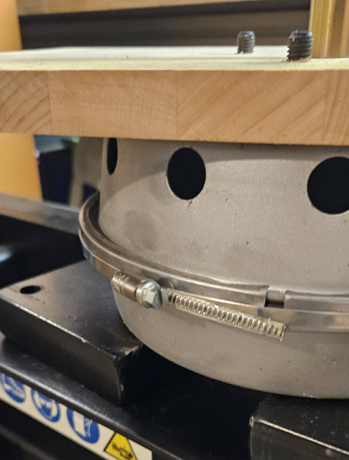 As mentioned, it becomes a little more complicated if you want to reuse the original ring. To do this, we placed the Hydrak canister in a hydraulic press with a wooden plate on top. Then by applying light pressure to the wooden plate with the press, the old clamp ring can be placed back around the pressure canister. To hold it in place, I attached a suitable hose clamp around the clamp ring itself.