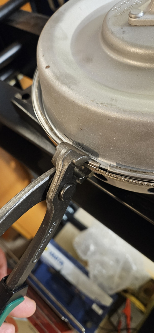 Once it is held in position, start to close the flared clamp ring around the edges of the two canister halves again using narrow pliers. You may need to modify/shorten the cutting edges of your pliers slightly for this task. Finally it has to be noted that marks from your pliers will be seen on the clamp ring. However, after the canister has been replaced in the engine bay they should hardly be recognized.